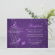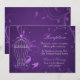 Estes cartões de receção de cor beringela metálica apresentam uma gaiola de pássaros caprichosa com espirais e um coração vermelho, e dois passarinhos fofos, pendurados ao lado da palavra receção em champanhe e roxo pálido. As palavras, em fontes alternadas de caligrafia e serifadas clássicas, são completamente personalizáveis. O texto pode ser alterado para criar um cartão de acompanhamento para direções, informações de alojamento e muito mais!