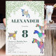 Celebrar o oitavo aniversário do seu filho com este bonitinho animal criado no 8º convite de aniversário com cabras e cabras de bebê em cabras. Cabras coloridas em cor rosa vibrante, roxo, azul, laranja, amarela e aqua com fundo foliar verde. Este convite de festas divertido é fácil de personalizar para criar um convite de festas único adequado para crianças e amantes adultos de cabras. Ilustrações originais de cabra psicodélica colorida da artista Catherine Sweetman