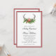 Um belo convite de casamento rústico em áreas arborizadas com galhadas de veados coberto em verde de inverno com um cardeal vermelho sentado no topo das galerias. Uma coordenação entre bordas escuras vermelhas e pretas enquadra o texto de forma magnífica.