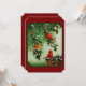 Um par de cardeais vermelhos nortes machos e fêmeas perca numa árvore sagrada, enquanto um terceiro cardeal se senta numa cesta de madeira tecida cheia de folhas e bagas ocas recentemente colhidas. Tudo num fundo vermelho festivo de férias. Imagem criada de uma pintura original de óleo por Crista Forest.