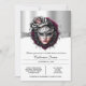 Um lindo gráfico aquarela com uma mulher vestindo uma máscara falsa de olhos veneziana prateada que tem detalhes decorativos e um grande rosa de prata e burgundy. Ela está vestindo uma linha de pescoço rufflada e é colocada contra um fundo branco estrelado que a torna pop. Modelos de texto preto editáveis podem ser personalizadas para atender às suas necessidades. Esta ilustração 3D realista é ideal para mascarada, carnaval, circo ou festival ou chá de panela.