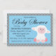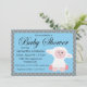 Um design de convite de chá de fraldas doce com borregos e bolinhas azuis bonitos sobre um fundo de cinza. Personalize com seus detalhes de evento editando as informações de exemplo no modelo de design. Você pode alterar fontes e tamanhos de fonte e mover o texto e os gráficos no convite para atender às suas necessidades.