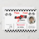 Crescendo Dois veículos velozes segundos aniversários gêmeos correndo em convites de festas de aniversários de crianças adoráveis com uma corrida de carros vermelhos. Um tema de carro de corrida para uma festa de segundo aniversário com uma ilustração de um carro de vintagem vermelho e as frases "Crescendo muito rápido."