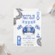 Festa de aniversário. Convide convidados para uma festa de aniversário de estilo com corrida de carros. Trilha de corridas de aquarela, posto de gasolina, bandeira de corrida, carro de corridas azul.