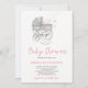 Vintage stroller fazer um convite para chá de fraldas de garota chique elegante. A placa tem um fundo branco no lado frontal e um padrão geométrico em uma cor d'água lavada com o fundo cor-de-rosa pincelado no reverso. Apresenta um roteiro de caligrafia de rico e uma moderna letra de texto contemporânea.— Ideal para uma festa de chá clássico de chic chic de exterior, primavera de jardim ou de verão elegante.
