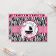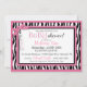 Impressão preto e branco selvagem e chique da zebra com acentos do rosa quente e uma carruagem de bebê preto e branco do impressão das bolinhas com o cartão do arco 3D-look e do convite da fita para um chá de fraldas do bebé.