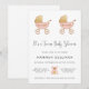 Celebrar a futura mãe das gêmeas meninas com este mínimo de chá de fraldas moderno convite com um retrô que apresenta aquarelas de duas carruagems bebê em cor rosa pastel com sotaques dourados. "É um Chá de fraldas Gêmeo" está escrito por baixo em um roteiro contemporâneo. Uma pequena coloração d'água de um ursinho cor-de-rosa pastel e dourado na parte inferior do convite separa blocos de texto da localização da parte e detalhes de RSVP.