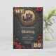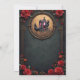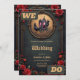 Carruagem gótica com Ravens e Rosas. Uma carruagem no estilo gótico sendo puxada por dois corvos vestindo chapéus superiores, definida dentro de um ornamentado, ouro circular. A carruagem é decorada com flores e tem uma cruz no topo. O fundo é um verde escuro, texturizado, e o quadro é rodeado por rosas vermelhas e ouros decorativos floresce. O humor geral é escuro, elegante e levemente caprichoso.