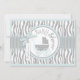 Cinzas selvagens e doces e impressões zebra brancas com sotaques azuis e carrinho de bebê bolinhas com arco 3D e fita para um cartão de convite para chás de fraldas.