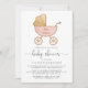 Celebre a futura mãe de uma distância segura com um carro de chá de fraldas. Este convite para chás de meninas apresenta uma cor de água rosa pastel e dourada de uma carruagem de bebê retrô e um "Chá de fraldas" escrito em um roteiro de na moda. Você pode personalizar o texto na carruagem ou deixar o vazio.