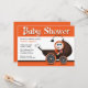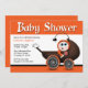 Estes convites para o bebê de Halloween, em laranja, castanho e preto, são projetados com uma carruagem de bebê assustadora e fofa e um bebê feliz pendurado ao lado segurando um pirulito.