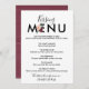 Este menu de beijo com letras florais marrom é perfeito para um casamento de outono. O design apresenta um pequeno buquê de flores burgundy e pêssego em tipografia negrito para um visual moderno e elegante. A parte de trás apresenta pinceladas de aquarela marsala.