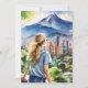 Este cartão mostra um retrato de aquarela de uma mulher loura em um terraço olhando sobre Medellín, Colômbia.