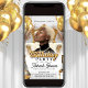 Este convite tem uma vibe sofisticada com detalhes festivos brancos e dourados, balões dourados e uma poltrona de trono sofisticada ao fundo. O layout inclui um espaço dedicado para enviar sua própria foto e editar os detalhes do seu evento. É uma escolha perfeita para grandes celebrações ou festas temáticas reais. Disponível para download digital ou impressão direta através do Zazzle, oferece estilo e conveniência.
