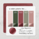 Depois de um mês estudando e observando as tendências de cores mais quentes, os combos de cores do casamento de 2021 estão dentro! Uma coleção de 10 paletas coloridas de casamento criadas com a coordenação do convite de casamento "Stationery Collections". Esta é a Placa de Paleta de Cores de Casamento de Chic Paperie na Estrada Terra Rosa de: Terra Rosa Rosa Rosa, Sage Green, Whisper Blush Pink, Dusty Rosa, Juniper Dark Green. Uma bela combinação de cores para um casamento cor-de-rosa tradicional e é perfeita para o outono, outono, verão ou inverno! Mostrado com amostras de cores planas e metálicas. As amostras de cores têm os códigos de cores hexadecimais. Obtenha seus cartões de amostra de paleta colorida para ajudar no planejamento e coordenação de seus detalhes de casamento, decorações e artigos de papelaria. Entregue-os à festa de casamento, às damas de honra ou ao planejador de casamento! Então veja minhas coleções para ver o convite de casamento e suites de decoração de festas criados na paleta de cores mostrada! Ou simplesmente a busca: Coleções de Casamentos 2021 de Chic Paperie (no google ou zazzle) para vê-las todas!