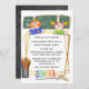 Lembre-se dos bons velhos tempos com este convite temático "de volta à escola" que inclui um menino com cabelo vermelho e uma menina com pigmeus loiros em formato de desenho animado. Eles estão sentados em frente a um quadro verde que tem equações nele e se inclinam contra o topo de um quadrado dourado falso que tem uma letra de giz preto para o seu texto personalizado. Um lápis arco-íris e um clipe de papel de cor clara fazem a borda inferior. A parte de trás do convite tem um quadro preto texturizado.