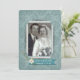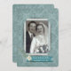 Casa aberta para qualquer ano de aniversário de casamento com moldura de foto personalizada do casal. O fundo é um damasco azul-turquesa cintilante com moldura de canto e buquê.