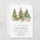 Este convite aberto de Natal chic apresenta três árvores de Natal e presentes/presentes em aquarela. O verso apresenta um fundo branco com padrões de árvore. Personalize-o para as suas necessidades. Você pode encontrar produtos correspondentes na minha loja.