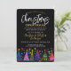 Um convite de festas de Natal lindo. Esta design colorida e brilhante mostra árvores de Natal pontilhadas e tipografia na moda. Fácil de personalizar com os seus próprios detalhes da festa de Natal aberta.