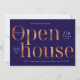Crie os convites para negócios modernos para seu evento imobiliário ou casa aberta com este elegante efeito azul-marinho e ouro de bronze Convite à Casa Aberta. Este convite para eventos de venda de propriedades profissionais apresenta um layout mínimo com fontes serif e espaço em negrito para o seu logotipo e detalhes de eventos personalizados.