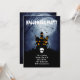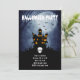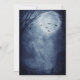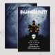Um convite de dois lados com uma casa assombrada negra, um crânio e um fantasma numa noite azul assustadora. O texto branco do "Festa de Halloween" está na frente. Personalize e personalize os detalhes da parte frontal. As costas mostram o fantasma e os morcegos. Este cartão é assustador, etéreo, assustador e legal. Pode ser combinado com um envelope azul correspondente.