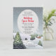 Este convite clássico em estilo de terra de maravilha do inverno apresenta neve caindo sobre uma encosta com árvores sempre verdes e uma casa no vale. Um design de inverno perfeito para uma festa de Natal ou de Férias.