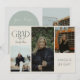 Convite moderno de anúncio de graduação boho com fotos na parte de trás. Se desejado, o verso do cartão pode ter texto adicionado para mais informações sobre a educação ou festa de casa aberta