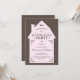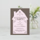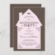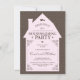 Convite para o aquecimento doméstico elegante (4,5 x 6,25") com um contorno rosa pálido de uma casa sobre um fundo ornamentado marrom. Na moda design, também disponível em outras cores. Para obter solicitações personalizadas ou ajuda para personalizar, use o link de contato de armazenamento acima.