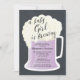 Quadro divertido moderno Uma menina está criando chá de fraldas de casais com uma caneca de cerveja cheia de cervejas roxas leves em um fundo preto no quadro.