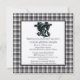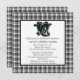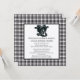 Um convite para chás de casamento casais num tema ocidental. Fundo é uma xadrez preta e branca sob um quadrado de branco com texto preto. Felt White paper foi escolhido.