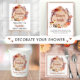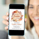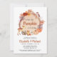 Convite russo para chás de fraldas de outono, com uma coroa aquosa composta por um tronco de árvore, animais de floresta fofinhos (coruja, veado, esquilo e raposa), flores de queda e abóboras. Um "Docinho Pumpkin Está a Caminho" é escrito numa mistura de simples tipografia e uma escrita de terracota. Especifique o sexo do bebê, se desejado (por exemplo, "está a caminho").