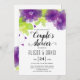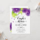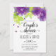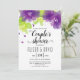 Buquê com flores etéreas roxas e roteiro cursivo caligrafia escrita à mão convite para chás de casais de casamento florais da primavera. A parte superior é coberta por um belo buquê de flores violetas roxas com folhas verdes.