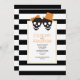 Casal de crânio preto, listras brancas convite para casamento laranja no Halloween. Um casal preto divertido com um arco e um chapéu emparelhados com uma elegante borda preta e branca são os elementos dessa tendência e convite moderno. Seu texto está em um quadro branco com contorno de ouro.