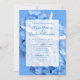 Convites de casamento azuis com estrelas-do-mar e flores de hydrangea design. O texto começa, "Junto com nossas famílias (ou pais)" com os nomes do casal em roteiro elegante. O texto azul é impresso sobre um painel branco, com a grande flor azul atrás. O grande peixe-estrela branco torna esta design perfeita para um casamento de verão ou celebração costeira.