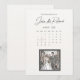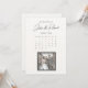 Cartão de salvar a data com data marcada no layout do calendário, com ilustração de selo postal em estilo de história em quadrinhos mostrando a imagem de um casal feliz no casamento.