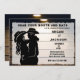 Defina o tom do seu dia especial com este convite de recepção de casais Rustic Western Barn. Com um charmoso fundo de madeira que exala elegância rústica, este convite é perfeito para uma celebração com tema de celeiro. A silhueta de um cowboy e uma cowgirl adiciona um toque romântico e autêntico do Oeste, tornando-o ideal para casais que amam o estilo country. Personalize o texto para incluir todos os detalhes da sua recepção, garantindo que seus convidados saibam que terão um momento inesquecível. Se você está organizando uma reunião casual ou uma festa sofisticada no estilo Western, este convite combina charme e estilo de forma linda.