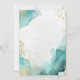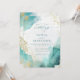 Este convite de casamento abstrato moderno na praia apresenta fontes modernas da moda com caligrafia cursiva estilosa, emoldurada por respingos de tinta alcoólica azul turquesa e dourada.