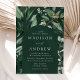 Convites elegantes de casamento com seus detalhes de casamento aninhavam dentro de um quadro arquejado cercado por eucalipto, samambaias e outros ricos verdes com um fundo verde escuro. Os convites de casamento do arco botânico revertem para um fundo verde-escuro sólido. Projetado para coordenar com nossa coleção de casamento Abundant Greenery.