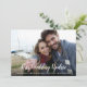 Anuncie seu casamento adiado com este cartão com fotos moderno. Ele apresenta um quadro horizontal de fotos que preenche a parte frontal da placa. O design é acentuado com texto de estilo manuscrito que diz: Nossa Atualização de Casamento. A parte de trás é verde sábio com um padrão de ponto e oferece texto personalizado para mais detalhes.