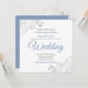 Estes belos convites para o casamento apresentam um design que é simples, sofisticado, chique, tradicional e moderno de uma só vez. O texto é cinza e azul-claro, com filgrão de folha fina prateada ou fritos florais nos cantos. Perfeito para uma cerimônia formal ou moderna.