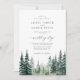Convite de casamento elegante rústico com paisagem de floresta de árvores de pinheiro aquarela e com tipografia script simples e sofisticada. +++++++++++ Adequado para verão, outono, montanhas de inverno, casamentos de destino de aventuras ao ar livre, camping em áreas selvagens da floresta.