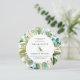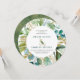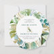 A folhagem botânica verde e azul-lacrimogênea enlacada com sotaques florais de ouro cria uma moldura para seus detalhes de casamento. Uma serra de ouro decorada com folhas verdes traz o design para o texto. Os nomes dos casais de casamento são um texto verde ousado. A parte de trás do convite para o casamento é uma lavagem a aquarela verde profunda com ouros