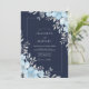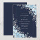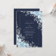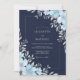 Este design apresenta um fundo azul marinho profundo acentuado por delicadas flores azuis gelo e folhagens cinza prateado. A paleta de cores frias cria um clima sofisticado e sereno para um evento sazonal. Detalhes botânicos elegantes, como folhas prateadas e flores suaves, adicionam um toque polido ao design.