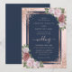 Convite floral de casamento elegante, azul-marinho, branco e ouro-rosa com um quadro de ouro-rosa adornado com rosas cor-de-rosa pinceladas e confete de ouro-rosa.
