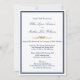 Um Convite para Casamento Azul, Branco e Dourado, Marinho Elegante, projetado com texto e borda de Marinho; com sotaque decorativo dourado, em fundo branco. O texto do convite inclui: Nomes de cheio de noiva e de grupo, Data de casamento, Hora, Local e Detalhes de recepção. O verso inclui os nomes e a data de casamento da noiva e do noivo com um sotaque decorativo dourado. Para personalizar, basta inserir seus detalhes em nosso modelo fácil, substituindo o texto de exemplo. Certifique-se de visualizar a coleção completa para placas e acessórios correspondentes.