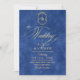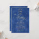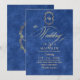 O elegante convite de casamento azul-na moda e ouro moderno, com uma elegante fonte manuscrita com caracóis e um monograma da noiva e do noivo. Clássico e elegante, simples e moderno convite.