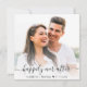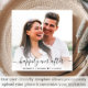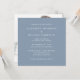 Convite moderno para casamento azul empoeirado, com seu convite em tipografia branca elegante de um lado e sua foto sobrecarregada com "Feliz Nunca Depois" em um roteiro chic com sucos e seus primeiros nomes e data de casamento se juntaram com um coração do outro lado.