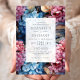 Um elegante design floral com hidrangeas exuberantes em tons de rosa e azul fornece o fundo para o texto da cinza de carvão em uma tela retangular branca. O design floral é repetido na parte traseira da placa.