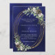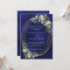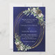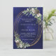 Para um casamento no inverno. Um fundo azul marinho, incolor, decorado com cones, bagas brancas e verde. Uma falsa estrutura oval dourada. Personalize e adicione seus nomes e detalhes.