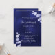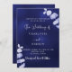 fundo azul marinho, decorado com caules de eucalipto, galhos. A cor azul é irregular. Personalize e adicione seus nomes e detalhes. Fundo: fundo azul marinho. A cor azul é irregular.